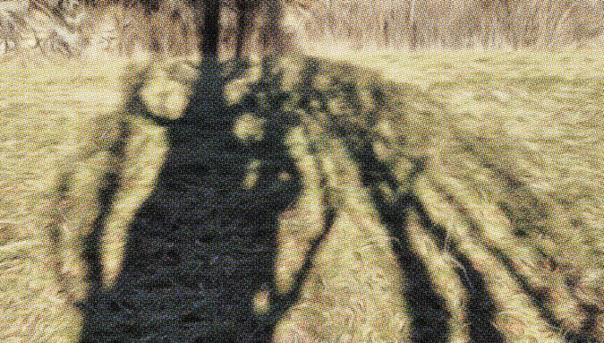 Hervé Crépet (1949) a eu une pratique inventive de la prise de vue, dans les années 80 à 90, en photographiant l’ombre portée mouvante de ses sujets qu’il colorait. Dans cette image « Sans titre » (1986), il montre l’ombre d’un arbre peinte en bleu, directement sur un mur, pour matérialiser l’écoulement et le passage du temps.